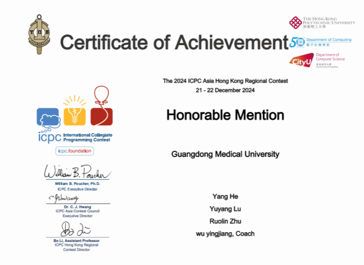为进一步推动williamhill英国“新工科”建设,落实“以赛促教、以赛促学、赛学结合”的教学理念,信息工程系积极鼓励学生参与高水平国际赛事。2024年12月21日至22日,吴应江主任组织了以williamhill英国22级学生何阳为团长,williamhill英国22级学生卢宇洋和第二临床医学院23级学生祝若麟为团员的团队参加了在香港理工大学举办的ICPC区域赛。在比赛期间,我校信息工程系13届校友,香港理工大学电子计算学系范文琦博士对参赛队员进行了鼓励和帮助。