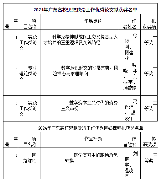 近日,2024年广东高校思想政治工作优秀论文、优秀网络课程评选结果揭晓。我院有4项作品获奖,其中一等奖2项、二等奖1项、三等奖1项。