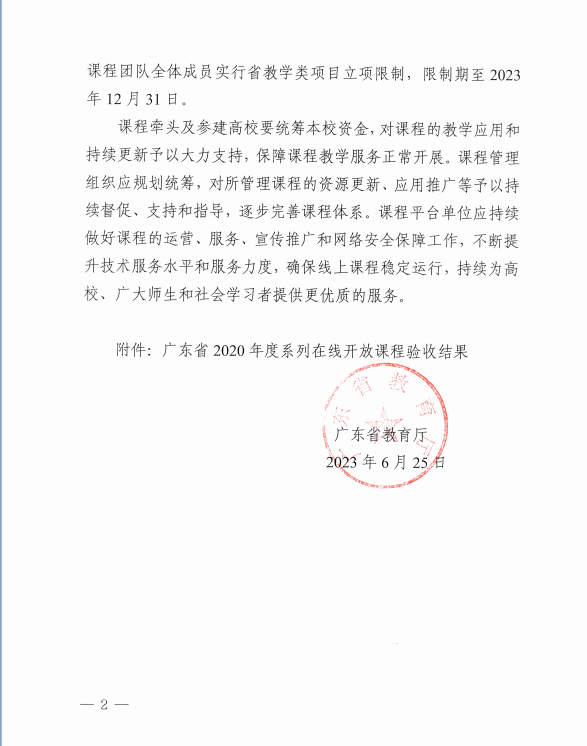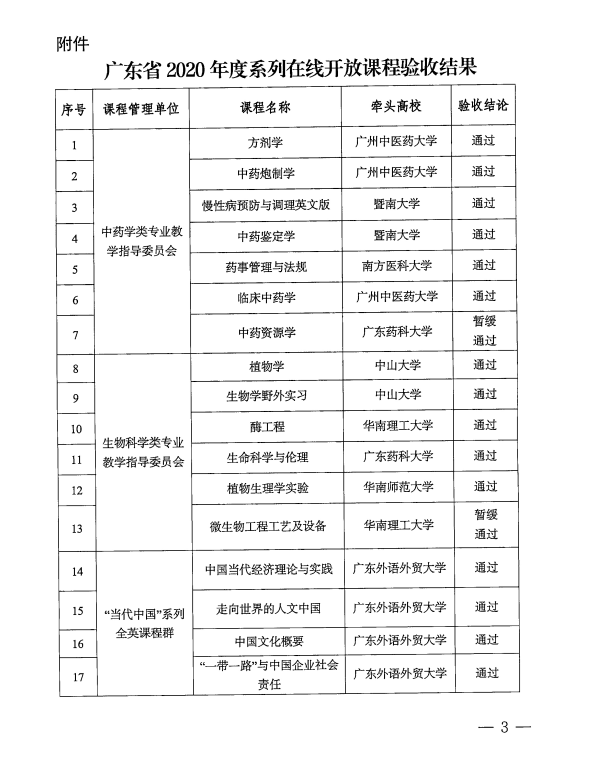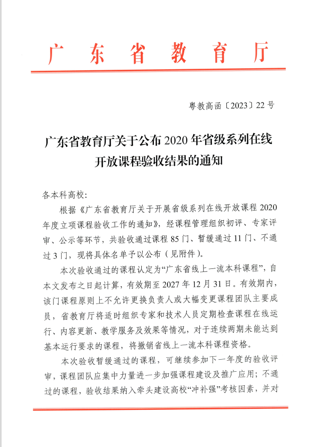 根据《广东省教育厅关于开展省级系列在线开放课程2020年度立项课程验收工作的通知》,经课程管理组织初评、专家评审、公示等环节,我院共有2门在线课程通过验收,并认定为“广东省线上一流本科课程”。