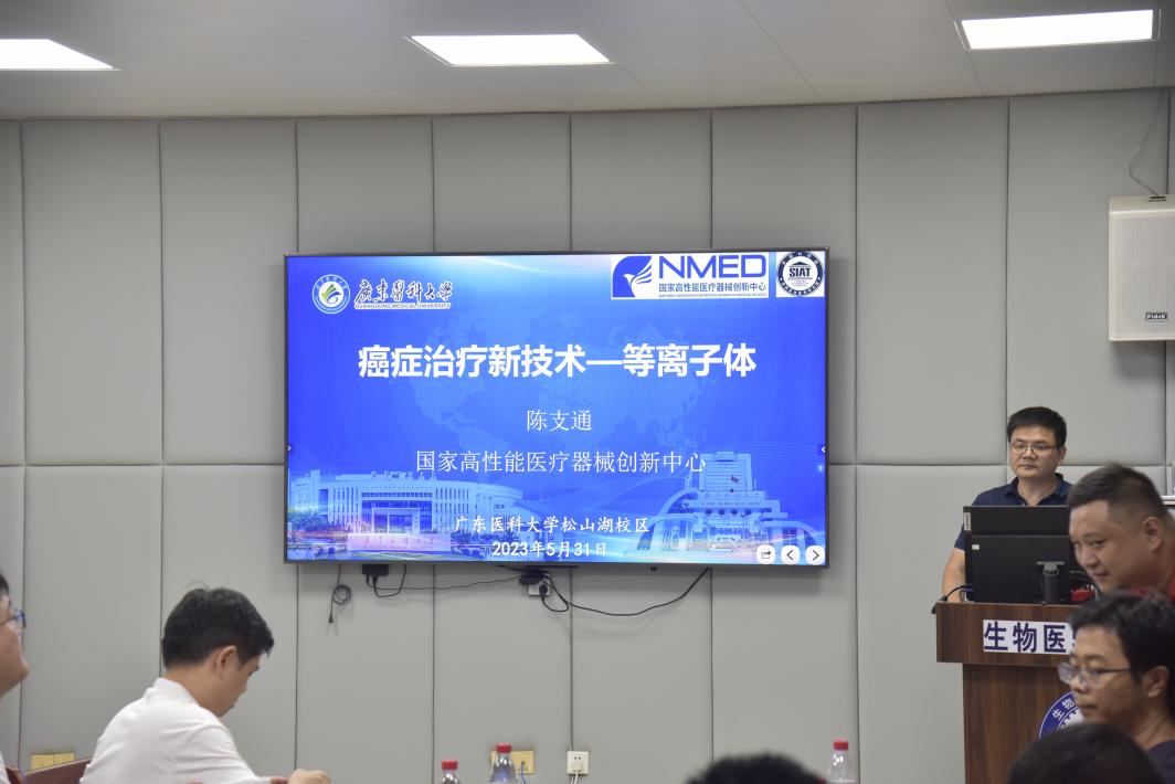 随后国家高性能医疗器械创新中心陈支通教授作了题为《癌症治疗新技术--等离子体》的报告,他是国家自然科学基金优秀青年基金获得者 (海外),国家高性能医疗器械创新中心创新研究院院长助理、先进治疗中心主任,中国生物医学工程学会生物电磁学专委会委员。他从癌症患者病例基数、等离子体形成原理、等离子体临床试验案例等方面对等离子技术应用进行分析,通过生动具体的临床案例,为师生们介绍了等离子体作为新型治疗技术的知识,丰富师生们对等离子体应用的了解。