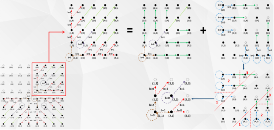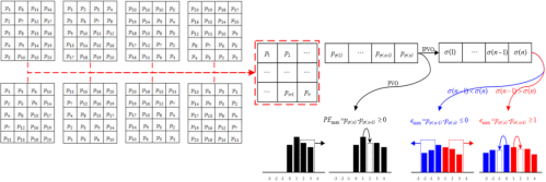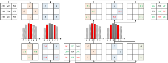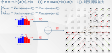 基于前一项研究我们进一步探索了使用分块内第三大/小像素去预测两个最大/小像素产出预测误差,并将所得预测误差两两结对形成误差对,最后构建针对误差对的修改规则实现高维预测误差扩展。传统预测误差扩展主要由两类映射组成,相比之下针对误差对的修改规则可以有更丰富的映射,具体如图2所示。通过结合误差对的分布特征来灵活构建相应的二维映射,我们实现了更优的预测误差修改方法。图3揭示了高维预测误差扩展的原理。