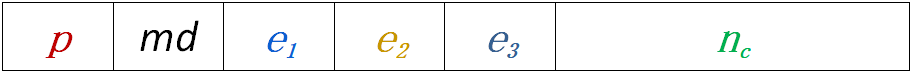 图2, 像素块的编码示意图,P为预测值占8个bit,md为预测误差长度占用3个bit,e1、e2和e3表示像素块内其他像素与预测值的误差,需要占用3×md个bit,nc为该像素块的嵌入空间。