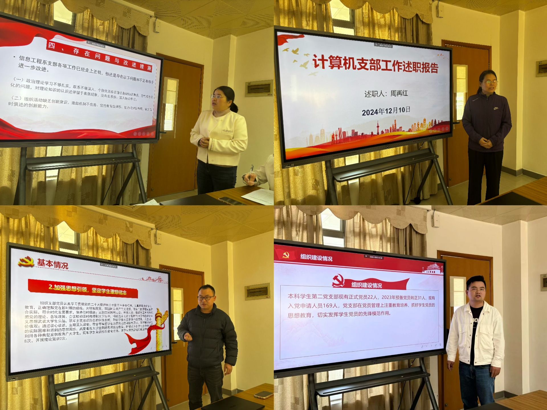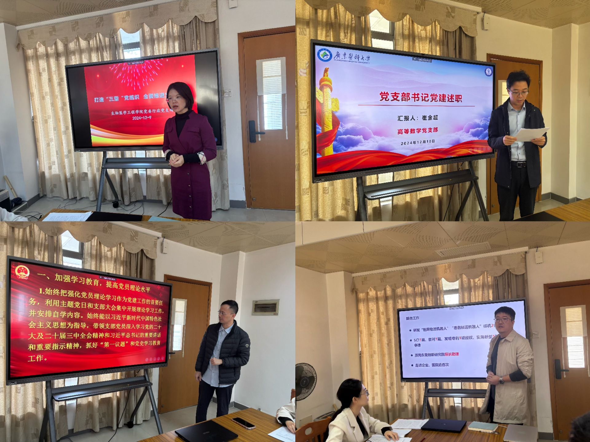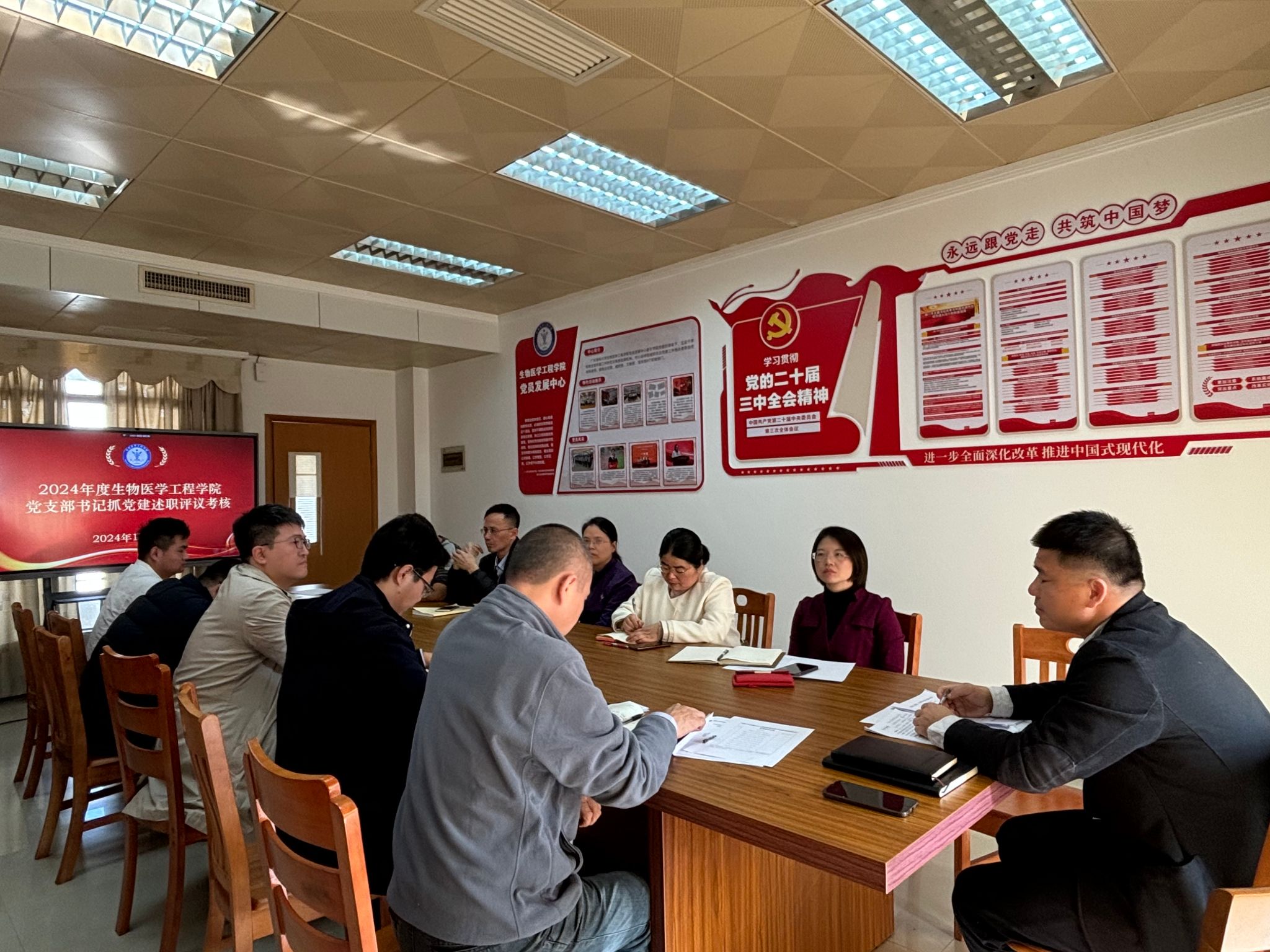 会上,10位党支部书记依次进行述职,围绕党建引领、党风廉政建设、业务工作融合、基层党建创新等核心议题,详细汇报了各自党支部在“三会一课”、主题党日活动、科研创新等方面的具体举措与成效,深入剖析存在的问题与不足,并提出了针对性的改进措施与未来规划。与会同志认真听取报告,充分肯定各师生党支部书记的履职表现,并对各支部未来的发展方向和重点任务提出了明确要求。