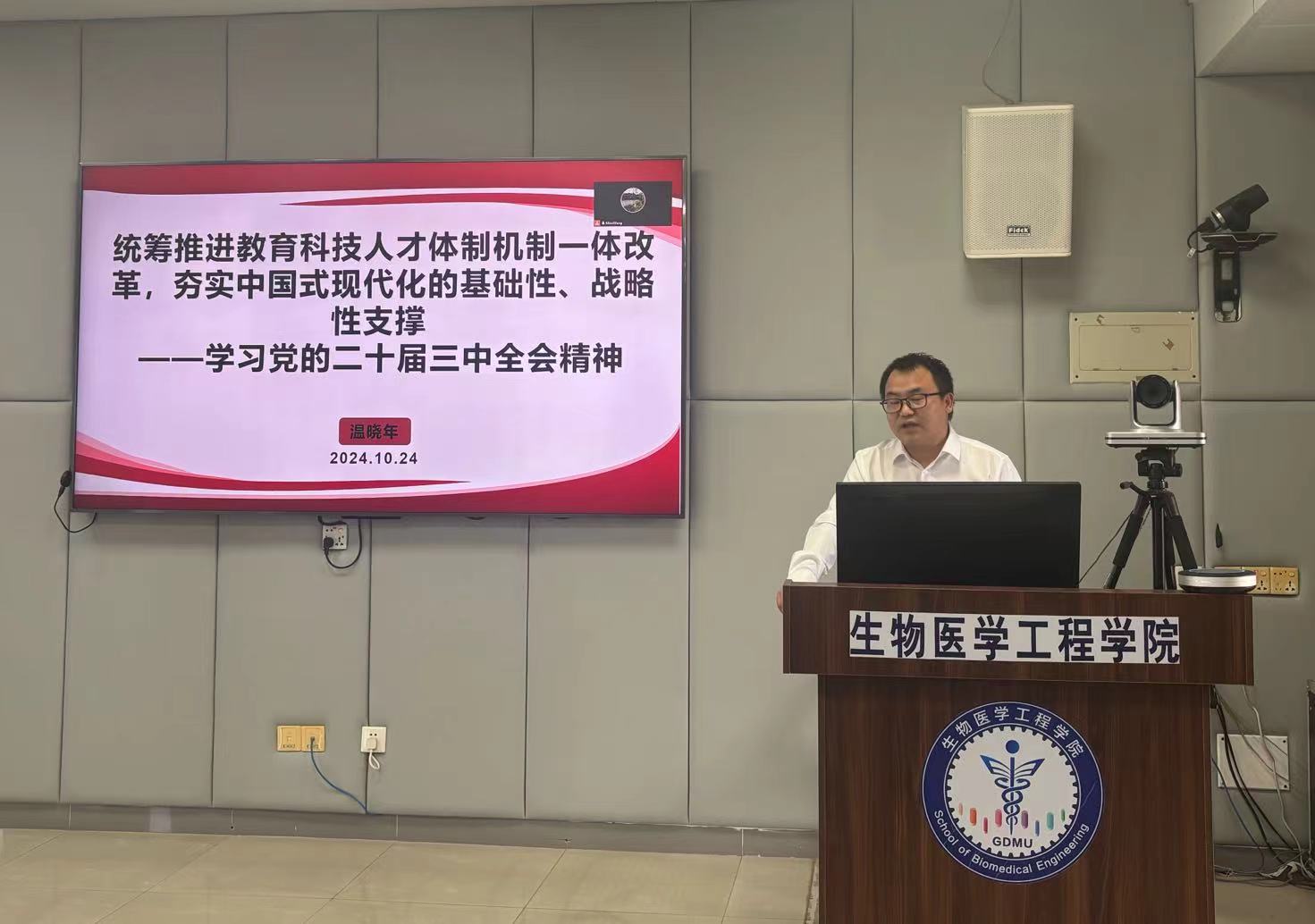 他通过列举事例,帮助大家更直观地理解全会精神,讨论在教育领域如何正确理解并推进中国式现代化。党的二十届三中全会提出,教育、科技、人才是中国式现代化的基础性、战略性支撑,强调要深化教育综合改革,深化科技体制改革,深化人才发展体制机制改革。一是坚持深入学习和领会教育强国、科技强国、人才强国的战略意义,高校作为科技创新和人才培养的重要基地,更要坚持教育、科技、人才“三位一体”统筹推进,持续整合科技创新资源和人才资源,向发展新质生产力要新动能;二是坚持全面贯彻党的教育方针,落实立德树人的根本任务,办好人民满意的教育;三是加强产教研深度融合,培养德智体美劳全面发展的医工人才。温老师鼓励同志们以此次宣讲会为契机,深入学习领会党的二十届三中全会精神,在学思践悟中凝聚起强大的奋进力量。