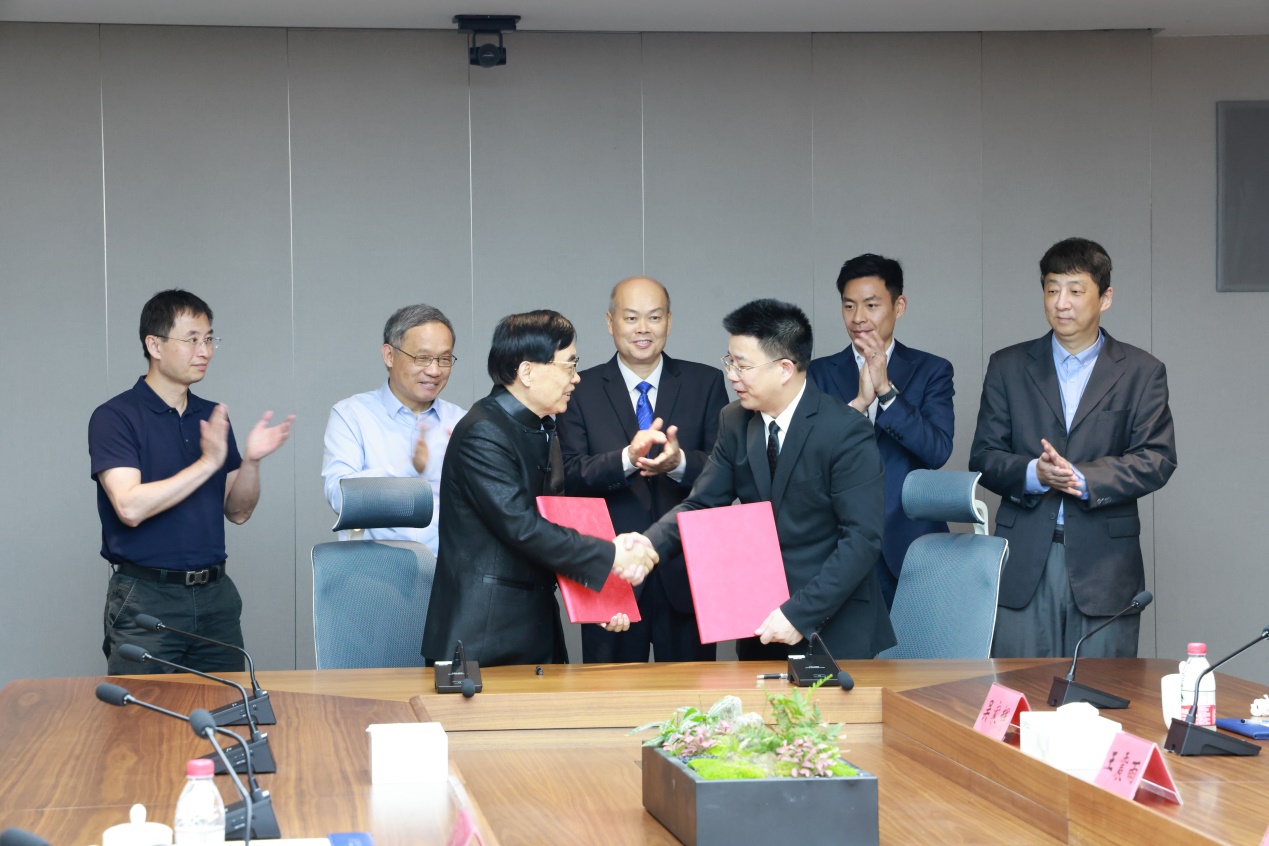 在学校党委书记、校长卢景辉,银镖资本联合创始人、香港生物科技协会副主席梁传昕,联影集团中央研究院院长陈群,香港城市大学生物医学工程系主任张勇,香港中文大学电子系副主任潘江鹏的见证下,学校党委常委、副校长曾志嵘代表学校与香港医学工程研究院创始人张元亭教授签约,标志着双方的合作迈出实质性步伐。