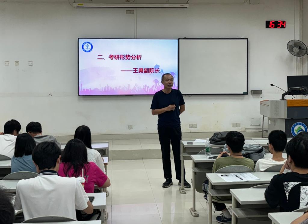 王勇副院长为同学们进行了深入的考研形势分析,他从求职就业角度对比了本科生和研究生的就业方向和未来职业生涯规划,讲解了学术型硕士与专业型硕士的培养方案及目标的区别,并从专业角度解析了各院校的考试大纲,通过生动具体的讲解和丰富的数据支持,使同学们对面临的考研形势有了更加全面的了解。他鼓励学生根据自身学习能力和个人特点来合理择校,坚定考研的决心,提醒同学们在备考过程中需要考虑可能遇到的各种挑战。